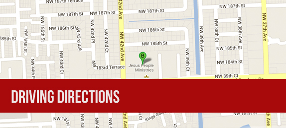 Take 1-75 South to Miami Gardens Drive/NW 186th Street exit. Travel East on Miami Gardens Drive (NW 186th Street will turn into 183rd street). Continue East to NW 42nd Avenue. Make a left turn on 42nd Avenue.